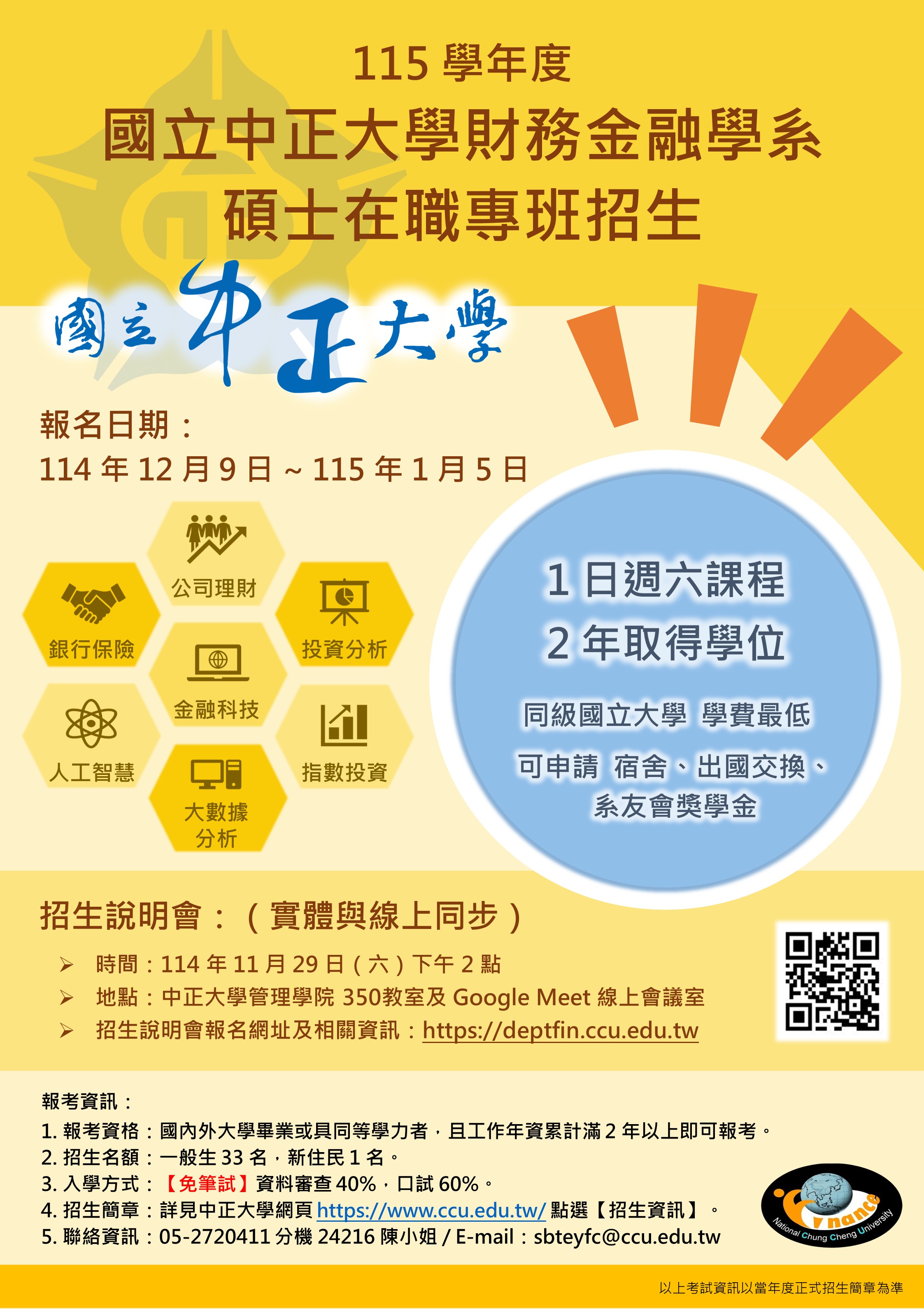 轉知:國立中正大學財務金融學系碩士在職專班115學年度招生訊息。