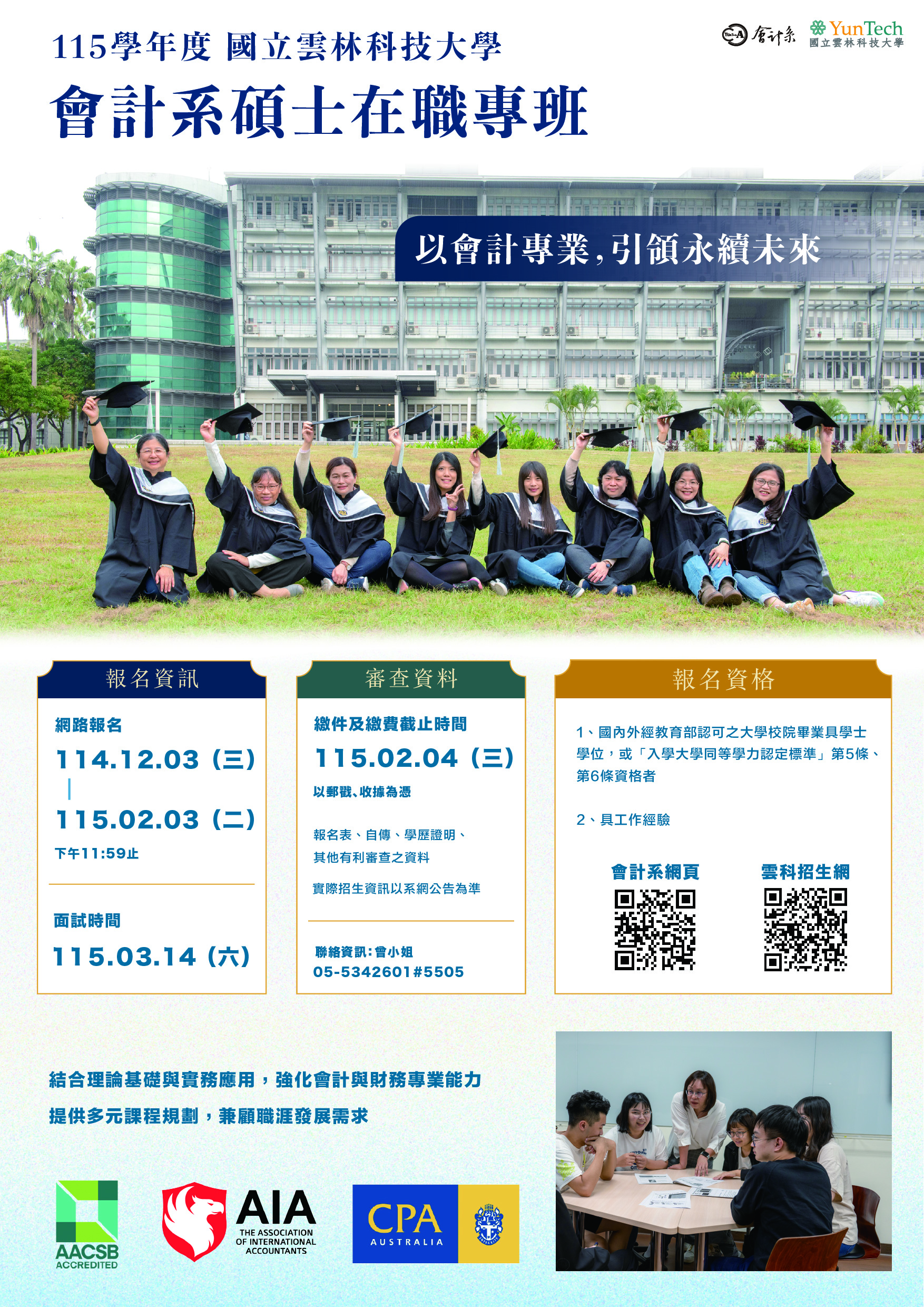 - 國立雲林科技大學會計系碩士在職專班招生網路報名時間:即日起至115年2月3日(二)下午11時59分止(一律採網路報名)。簡章下載及報名網址:https://examweb.yuntech.edu.tw/WebExams/Exam_W/