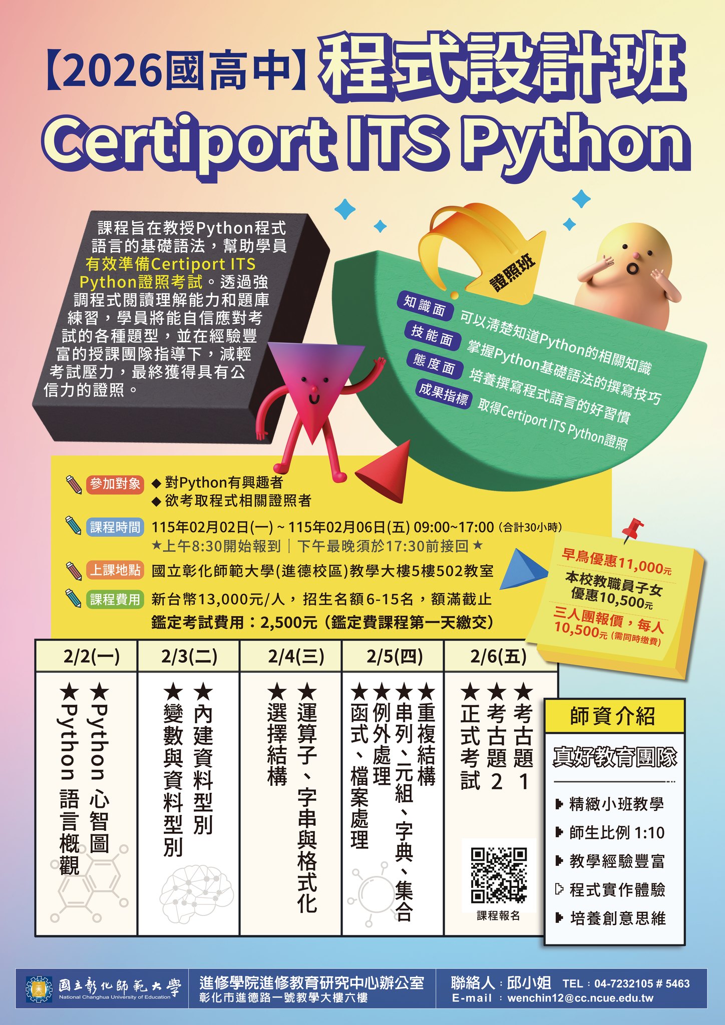 (一)【程式設計班】邱 小 姐:04-7232105 分 機 5463 ,E-mail :wenchin12@cc.ncue.edu.tw。