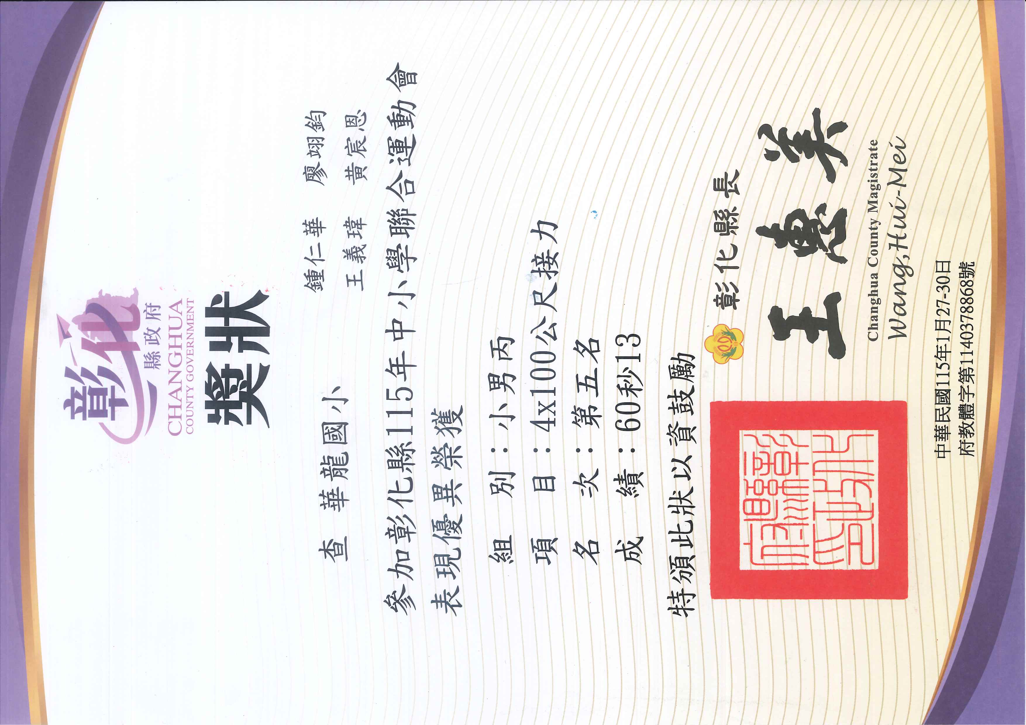 六甲鍾仁華、廖翊鈞、王義瑋、黃宸恩榮獲115年中小學聯合運動會小男丙組400公尺接力榮獲第五名